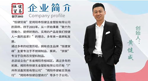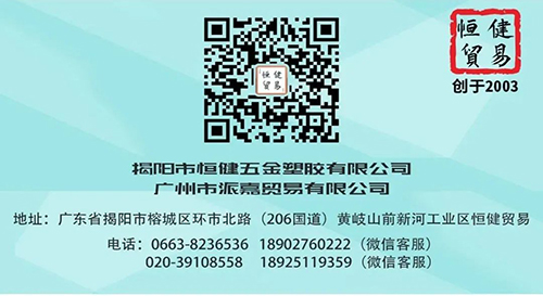 “恒健贸易”是揭阳市恒健五金塑胶有限公司的简称,创于2003年。从一开始秉着“致力为您推介、提供好用的、实用的产品是我们恒健人一直的追求!”的理念,多年来一直耕耘发展。