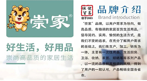 “崇家”品牌,以用户需求为导向,做高品质、有格调的家居百货生活用品。倡导简约、实用、愉悦的生活方式,是我们不变的追求。在充分了解用户需求的基础上,我们集生产,加工,销售为一体,主要有一次性用品、生活厨房、卫浴、收纳、家居、晾晒等等系列产品。以一流的品质和高格调的风格,得到了用户的一致认可,产品畅销全国各省市。